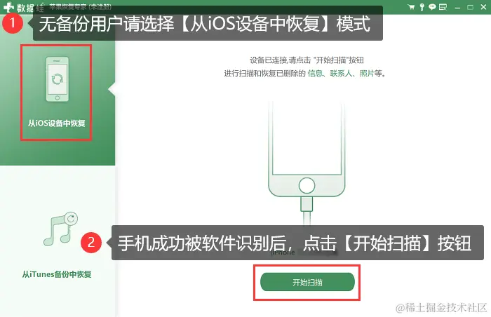 步骤2:因为是无备份恢复,所以要选择【从iOS设备中恢复】,然后点击【开始扫描】。