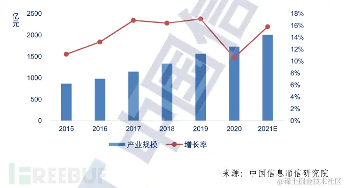 根据中国信息通信研究院发布的《中国网络安全产业白皮书(2018)》,我国2017年网络安全产业规模约为1100亿元;2021年,这一数值暴增至2002.5亿元(根据《中国网络安全产业白皮书(2022)》),较上年同比增长约为15.8%。按照这个增长速率,2022年我国网络安全产业规模将超过2300亿元,产业数值实现翻倍。