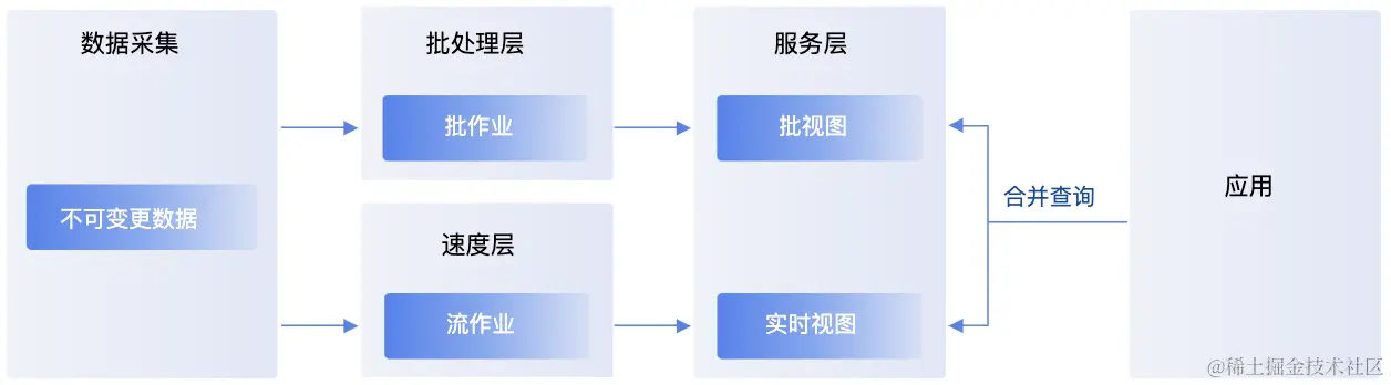 以 Lambda 架构的实现方法为例,Lambda以传统的离线数仓为主,然后引入了实时数据的处理链路。 T+1 数据仍然是走传统离线数仓链路,然后再加上一个实时的数据链路,再把这些实时数据和离线数据汇总到一起,然后再通过一个服务层提供数据服务,对外提供的服务可能是点查询,也可能是做复杂分析。