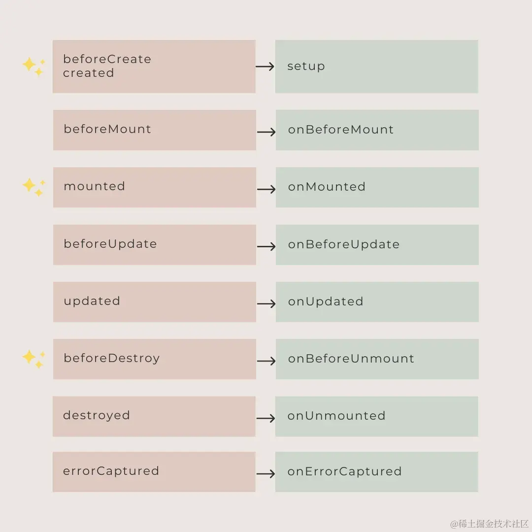 所有组件生命周期函数都通过添加on前缀或完全更名实现,下图详细列出了具体的变化: