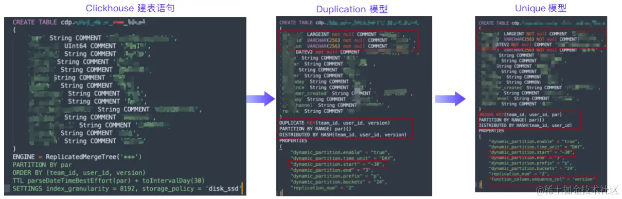 目前,我们针对 Unique Key 模型与 Duplicate Key 模型制作了 SQL 建表语句改写工具,如上图所示,支持通过配置参数自动将 Clickhouse 建表语句转为 Doris 建表语句,该工具的主要功能具体如下: