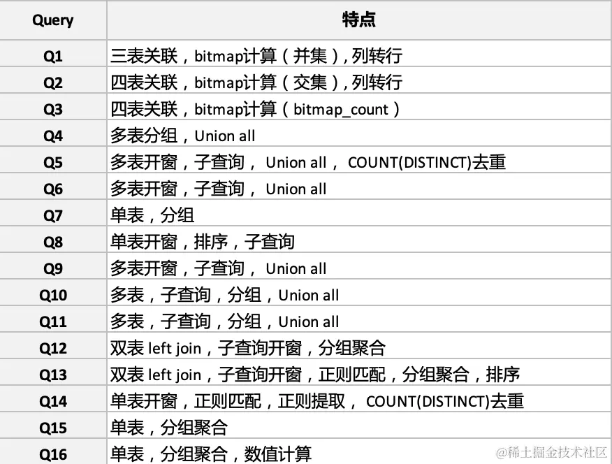 在进行查询 SQL 性能测试中,我们主要基于当前实际应用场景最多的三大系统进行查询,分别是 CDP、DMP、CRM 场景的对比。最终有效查询 SQL 16 条,线上场景下查询 SQL 的具体特点如下: