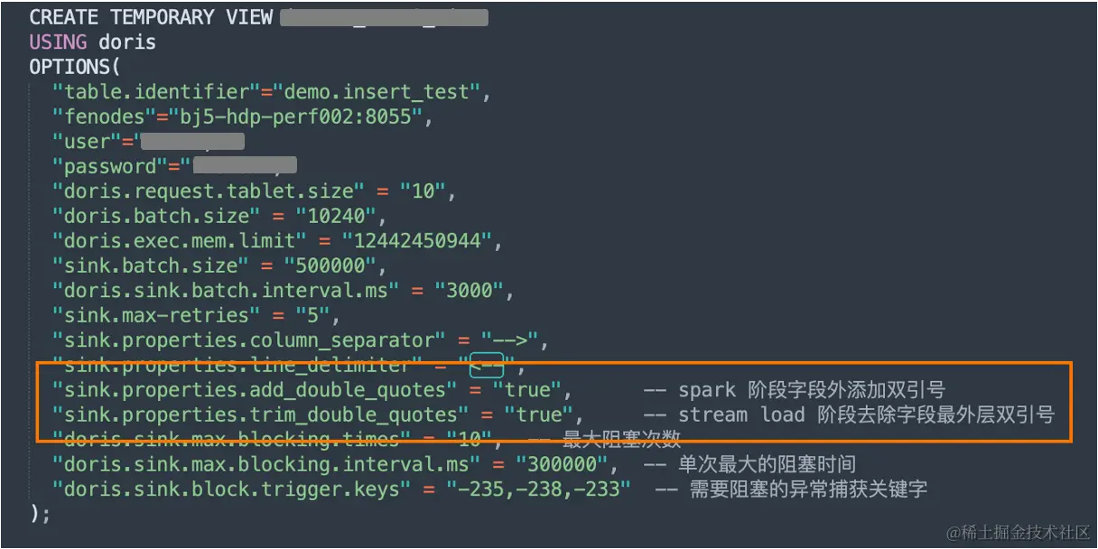 通过官方文档的提示,我们发现 Stream Load 中能够支持参数配置去除字段最外层的双引号,基于此我们决定在 Spark Doris Connector 写入阶段添加用户设置配置,在字段外层拼接双引号,保证不用选定特殊字符依然能够有效分隔,同时在 Stream Load 写入阶段添加去除最外层双引号的配置。通过两端配置,能够保证即使业务数据很复杂的情况下,也无需为字段符号的识别而烦恼,有效保证字段能够正常分割。