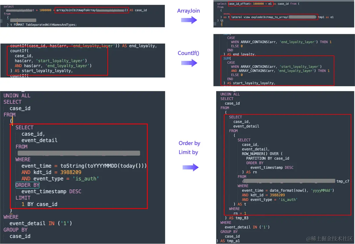 COUNTIF()需要转换为SUM(CASE WHEN _ THEN 1 ELSE 0)以达到相同的效果,ORDER BY与GROUP BY需要利用 Doris 开窗函数进行转化,此外 Clickhouse 利用Array Join进行列传行,对应 Doris 则需要利用Explode、Lateral View来展开; -