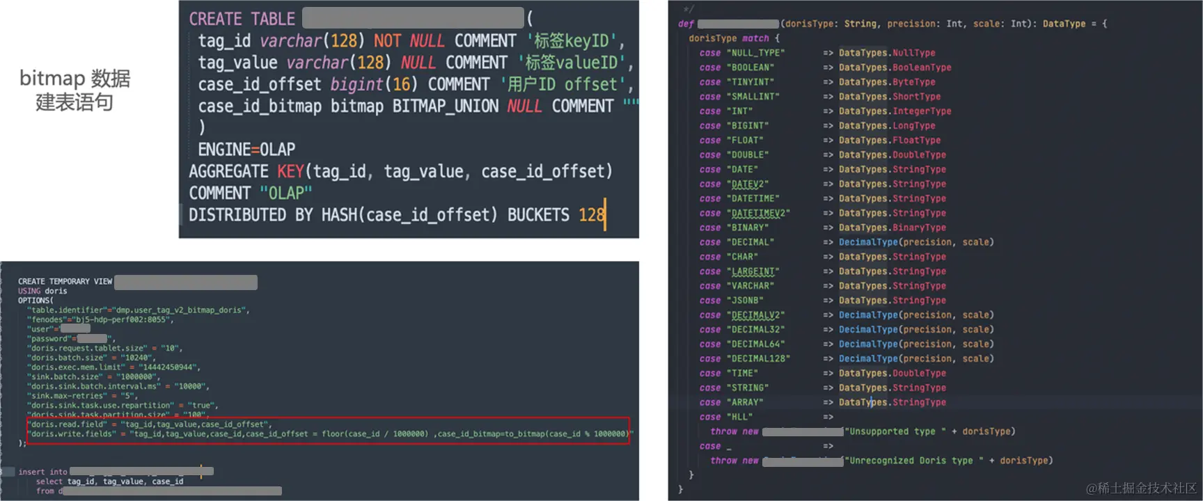 如上图所示,Bitmap 建表语句主要分为三个字段,其中最后一个字段是将 CASE_ID 进行 Bitmap 计算。在与社区成员沟通之后,提供一种设置 Doris Read Field 选项,写除 Bitmap 列外的其他列,同时在 Doris Write Field 中做映射处理。最终实现如上图所示方式通过 Spark Doris Connect 直接将 Apache Hive 明细数据导入 Apache Doris 的 Bitmap 数据中。