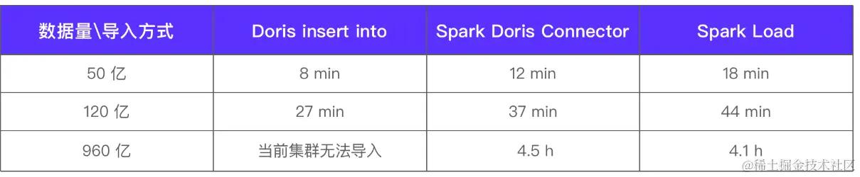 Spark Load 导入方式的特点是基于 Spark 资源进行 Shuffle、排序等工作将文件输出在 HDFS 中,之后 BE 节点能够直接读取 HDFS 上的文件并按照 Doris 格式写入。基于这种方式,在测试过程中我们发现当数据量越大时导入速度越快、越能够节省 Doris 的集群资源,不会带来较大性能损耗。