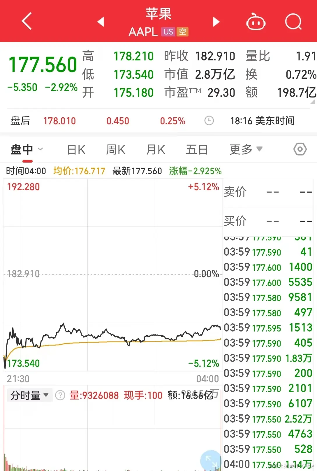 苹果股价连续两天大跌,实属罕见。截至收盘,苹果报 177.56 美元,跌幅 2.92% ,最新市值 2.8万 亿美元。苹果连续两天累计跌幅 6.5% ,其市值两天蒸发 1898 亿 美元(约 13911 亿元)。