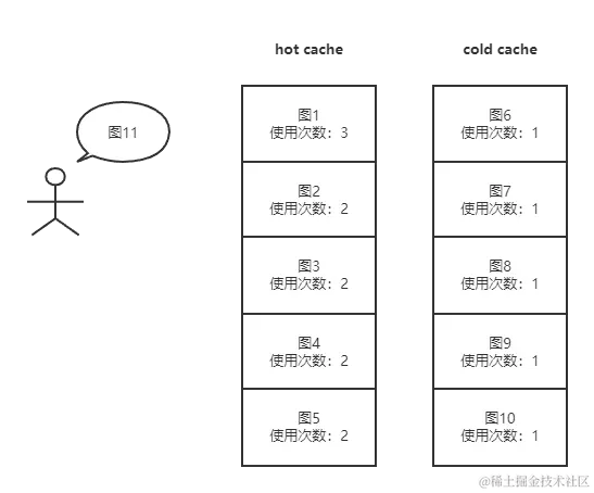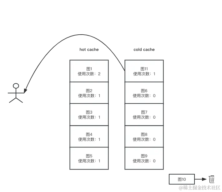 我们每次读取一张图片时,就将这张图片的使用次数加一,如果使用次数等于一,也就是第一次使用这张图片,就放入冷端最前面,同时将缓存中所有其他的图片使用次数减一,这个时候如果冷端满了,就执行淘汰策略,将最尾端的缓存淘汰。