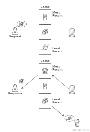 LruCache 实际上已经帮我们设计了一套缓存的淘汰策略:最近最少被使用的图片就会被淘汰。当我们访问一张图片时(这张图片可能没在缓存中,也可能在缓存中),LruCache 便会将这张图片放在缓存队列的最前面,当缓存满了之后,便会从缓存队列的最后面开始淘汰,缓存最后面的图片都是我们最近没有使用过的。