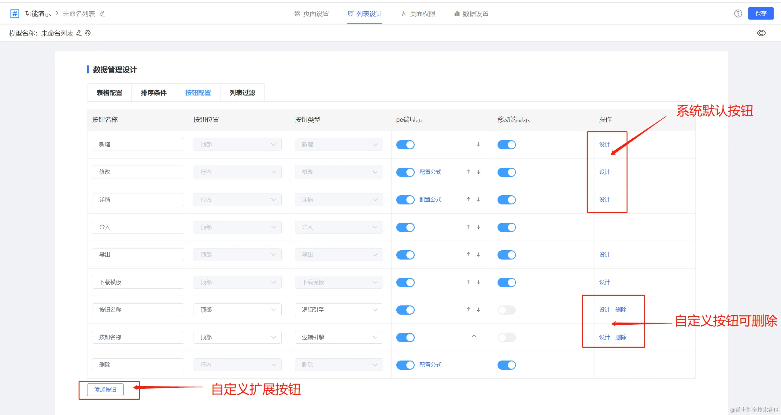 系统内置了 新增、删除、修改、详情、导入、导出、模板下载这几个按钮,不能删除以外,可以自定义按钮,并且可以自行删除