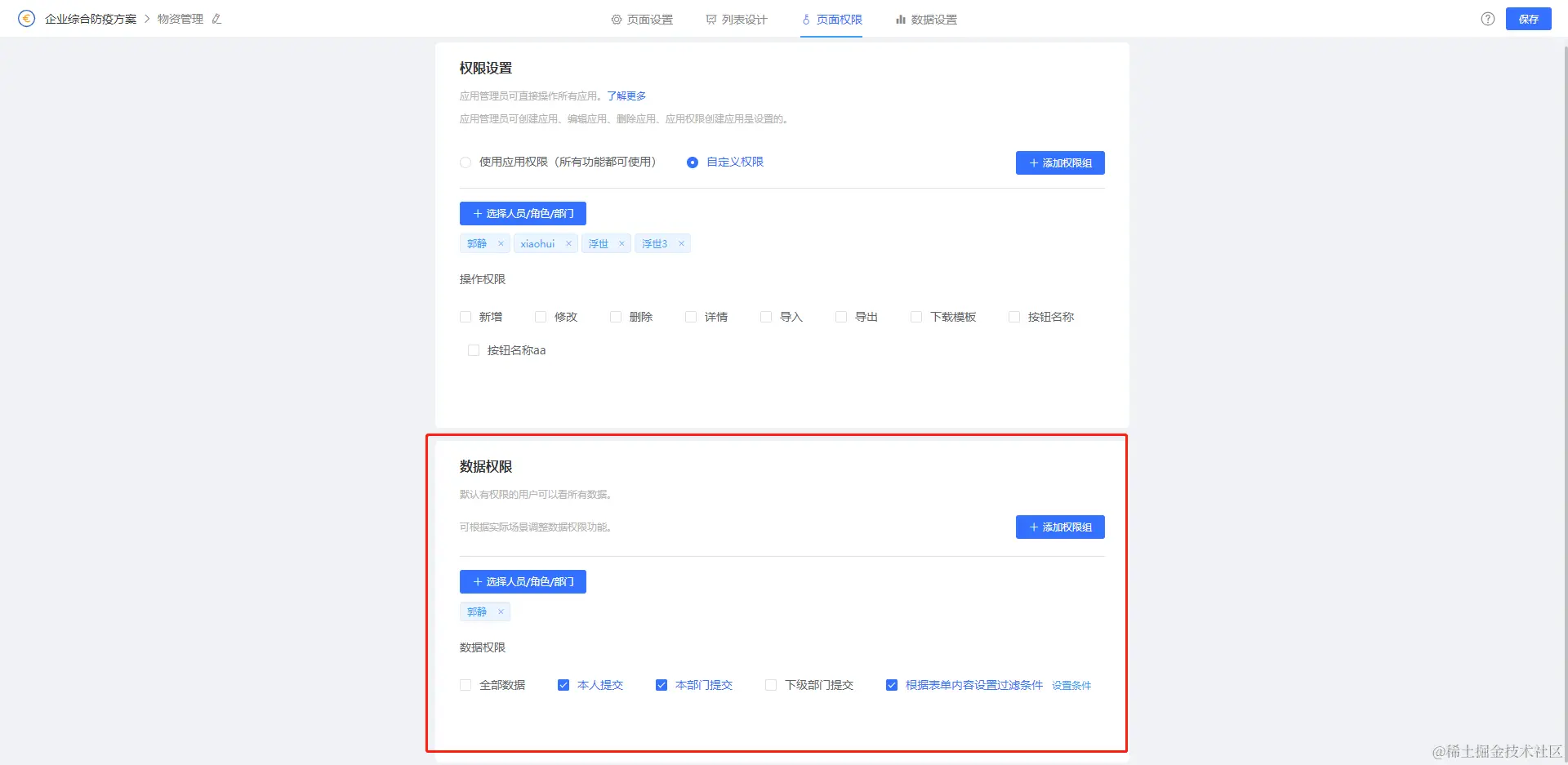 表达页的功能权限配置默认是全部赋权给应用授权的相关人员,也可以按照自定义配置,如图所示,选择自定义是,可以对人员设置可以操作的按钮。