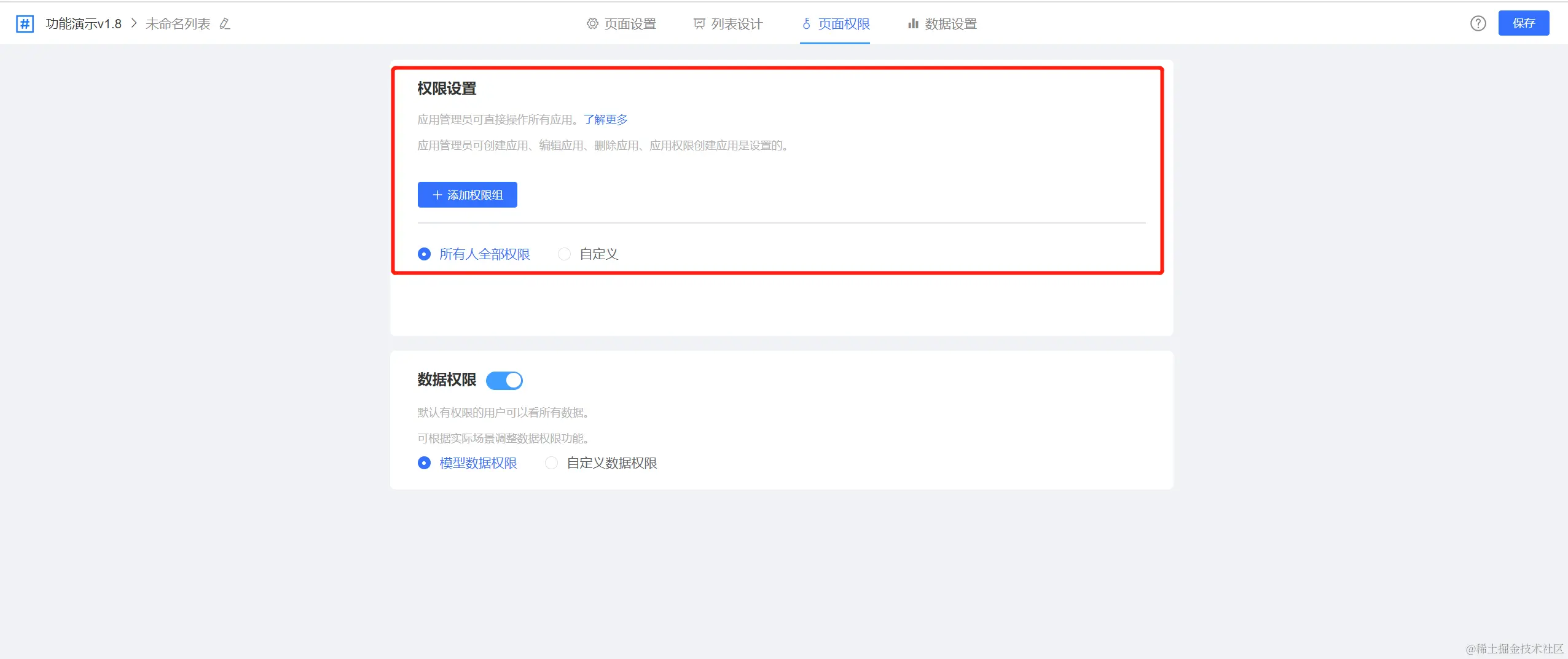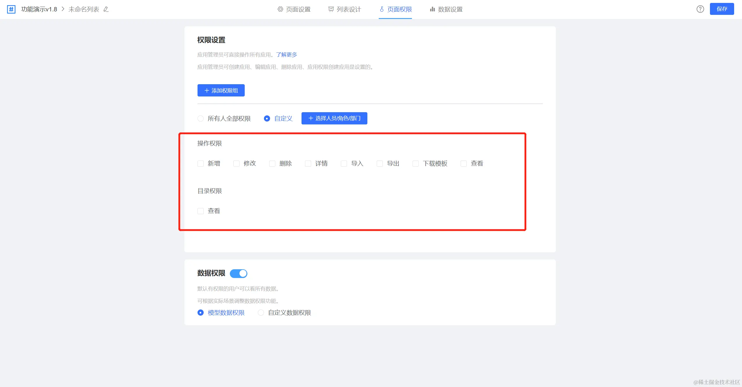 列表页权限配置包括两个方面:功能权限配置与数据权限配置