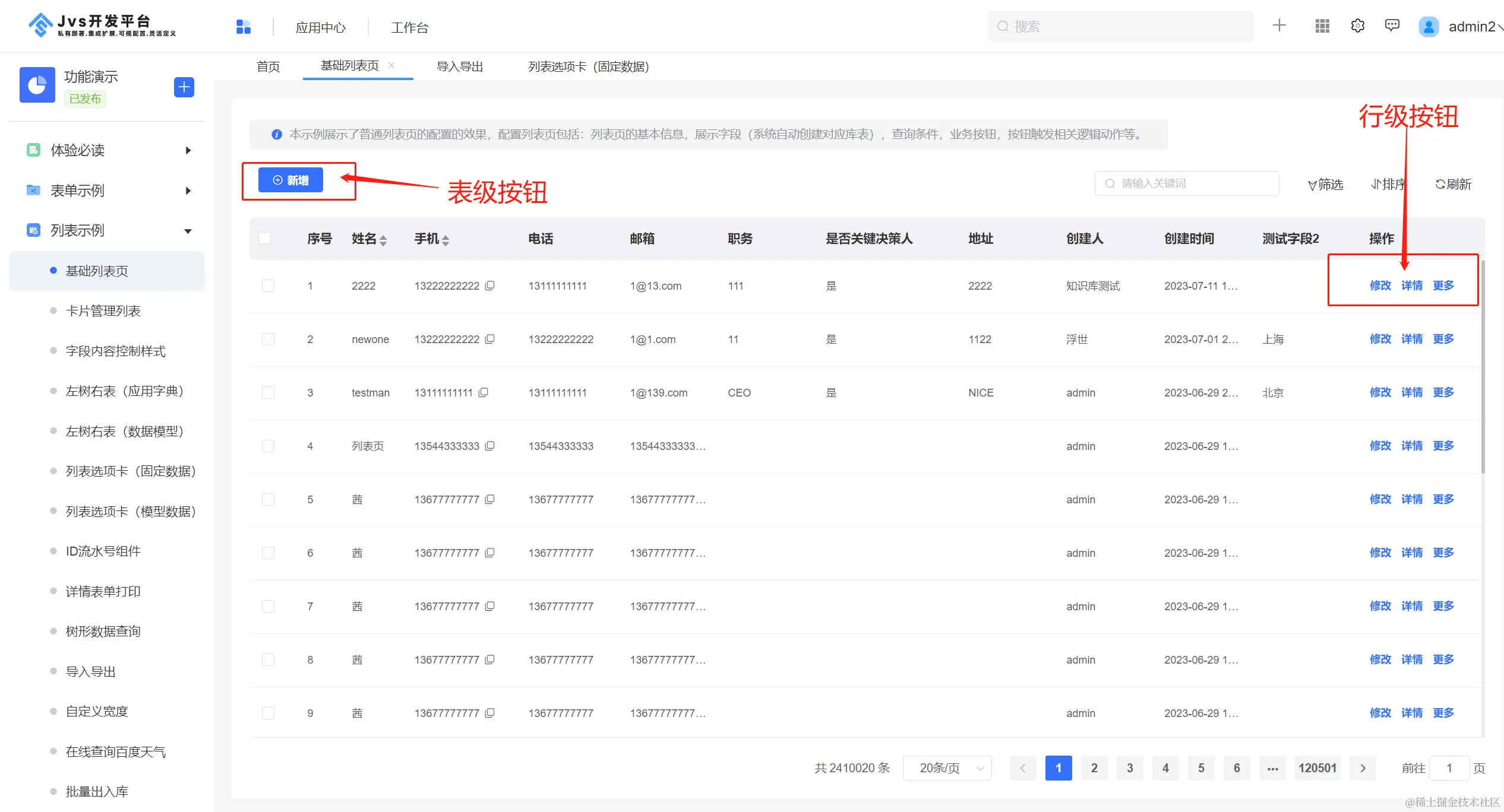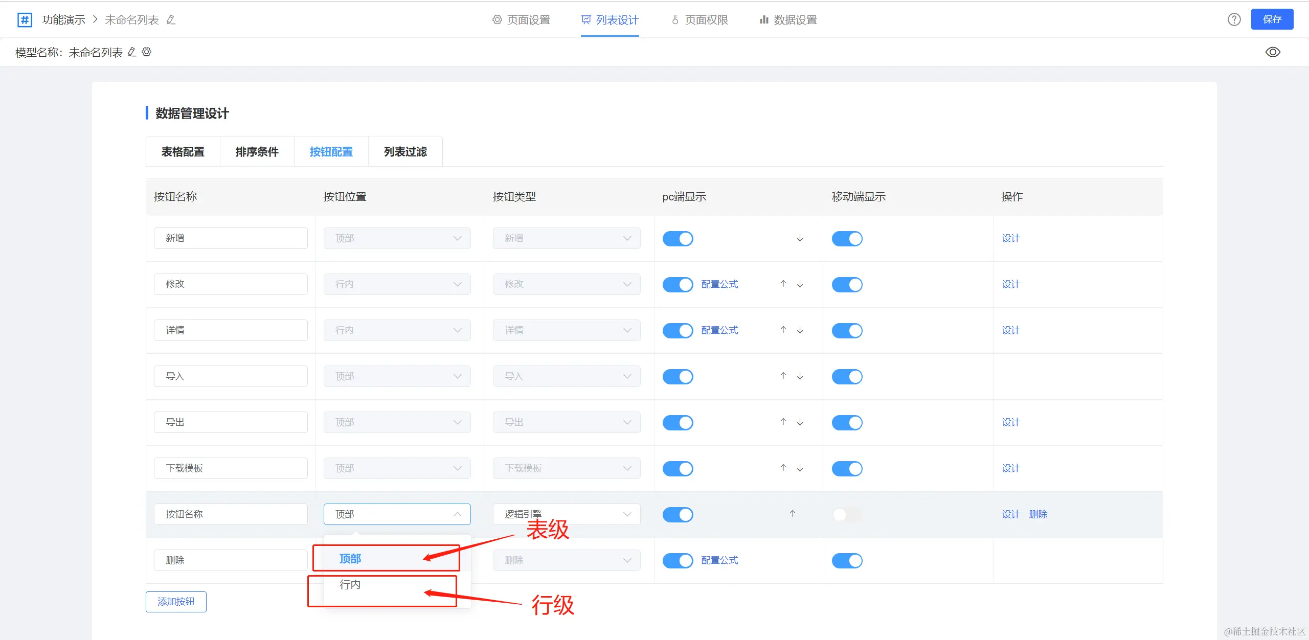 A、表级按钮;B、行级按钮,表级按钮往往用作新增或者是整体性的操作,行级按钮主要用于对单行数据的操作。行级按钮超过3个自动折叠。