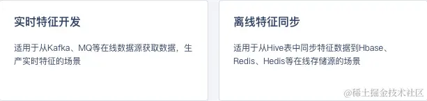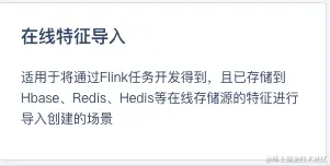 特征平台目前支持在线特征的存储,简单来说用户可以通过在AI平台点通过页面配置化的方式,将hive表数据或者kafka、rocketmq数据,同步到hbase、hedis、redis等在线存储中,也支持将数据存储到rocksdb进行本地化存储。如下图所示: