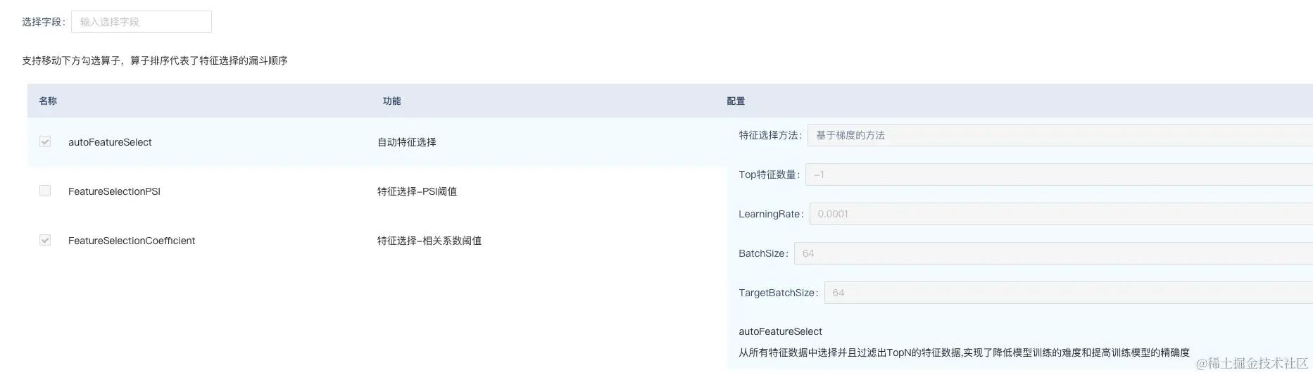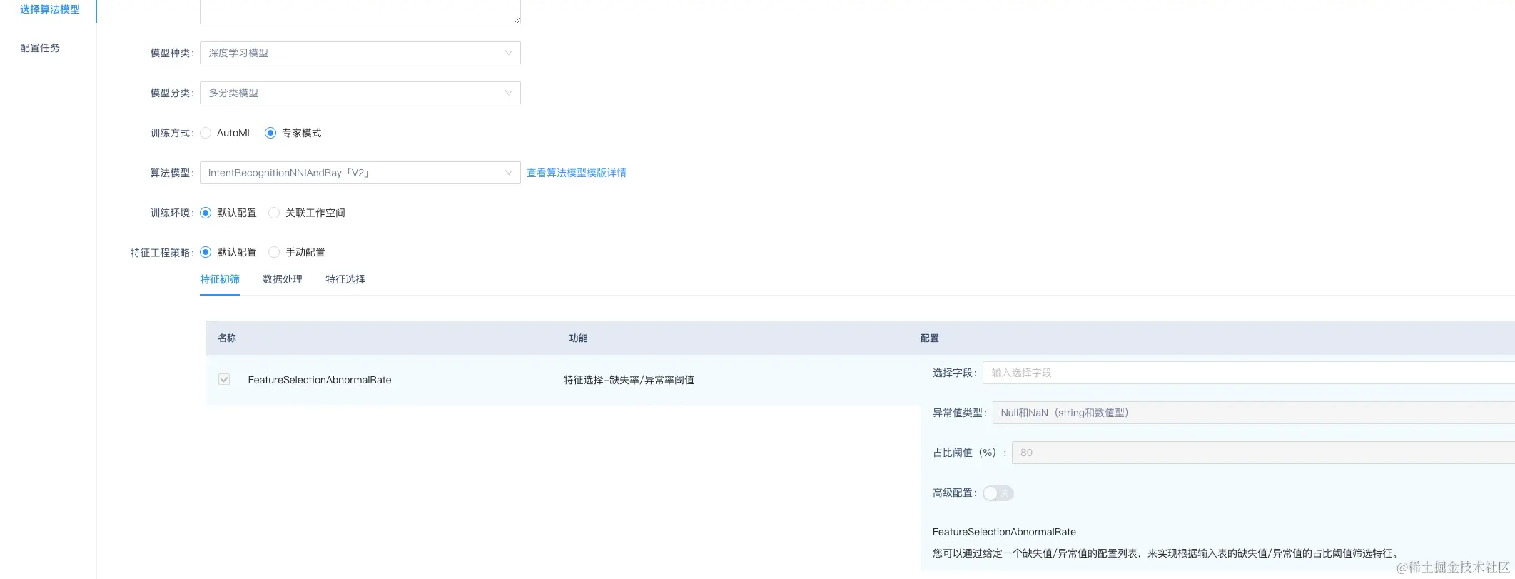 如下图所示,选择了IntentRecognitionNNIAndRay模型,该模型是用ALBERT写的意图识别模型。选择意图识别模型后,可以选择特征的初筛、数据处理、特征选择逻辑,在自动化训练前进行特征的处理,下图展示了特征处理逻辑,可以对特征进行特征初筛、特征加工、特征选择。