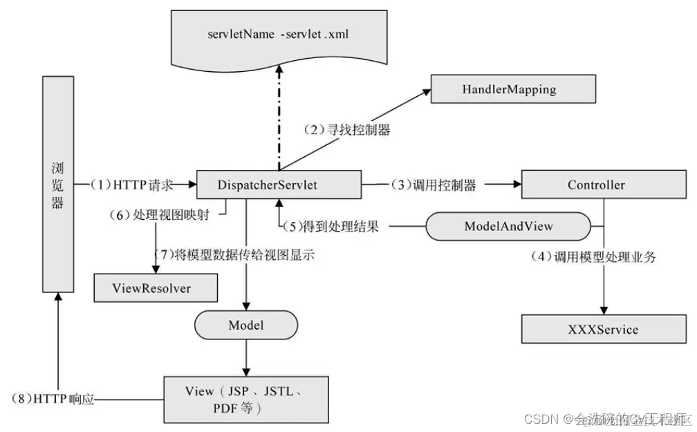 - DispatcherServlet:前端控制器,接受所有请求,调用其他组件。