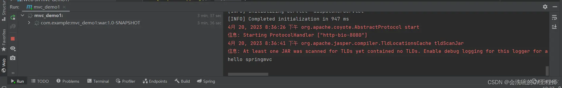 其实这里报404是正常的,因为这里要返回的是一个视图,但是我并没有写这个视图,所以就报404not found,但是观察控制台有没有输出hello springmvc,如果成功打印出则说明确实是运行成功了,如下图