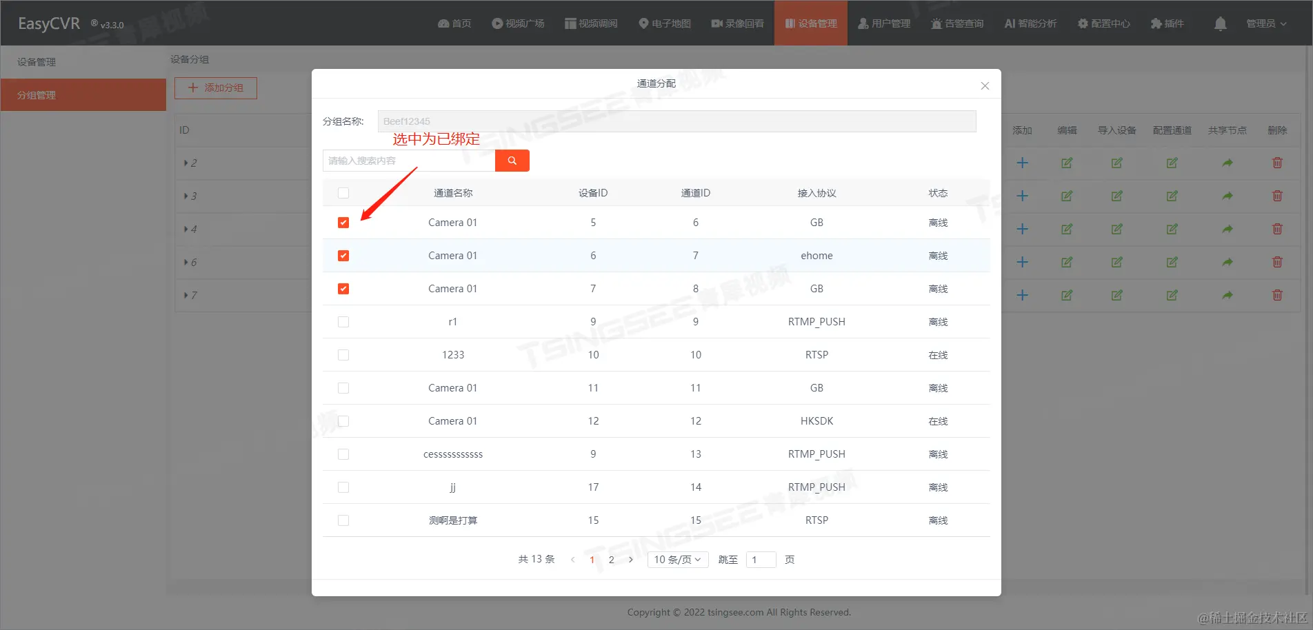 视频监控管理平台EasyCVR中的“分组”批量绑定通道在新版本中已经重新设计,其应用优点是直接精确到某个通道实现绑定、取绑操作,为用户的操作带来了极大的便利。