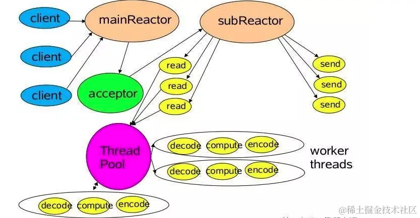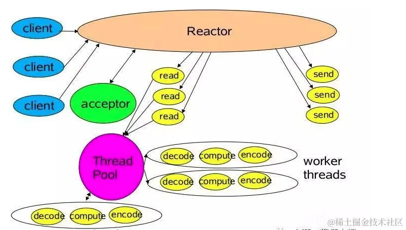 通过select监听客户请求,如果是连接建立的事件,通过accept接受连接,并创建一个Handler来处理连接后续的读写事件。这里的Handler只负责响应事件、read和write事件,会将具体的业务处理交由Worker线程池处理。处理所有业务事件,包括(decode => compute => encode) 过程。能充分利用多核机器的资源,提高性能。