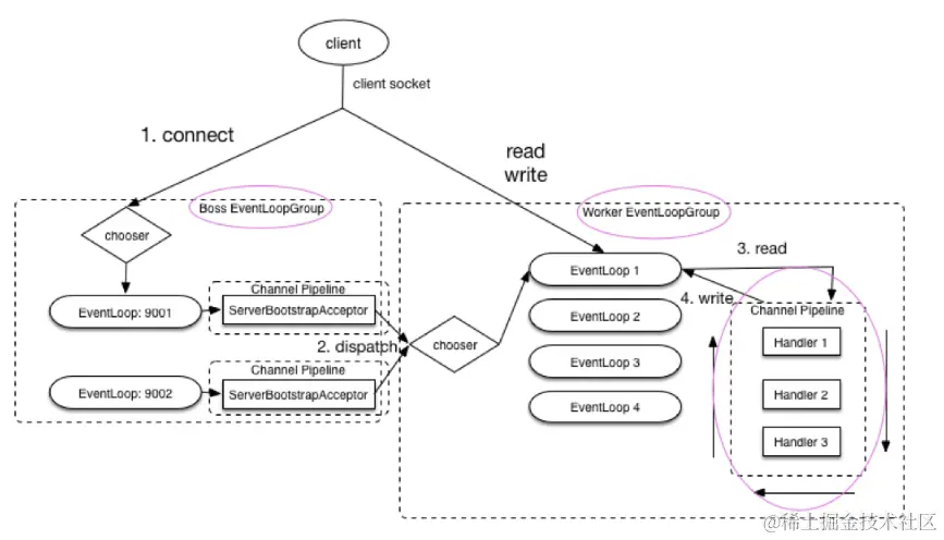 - 如果是读写事件,直接调用连接对应的Handler来处理,Handler完成 read => (decode => compute => encode) => send 的全部流程