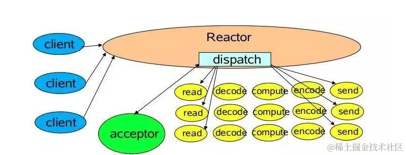 Reactor内部通过 selector 监听连接事件,收到事件后通过dispatch进行分发。