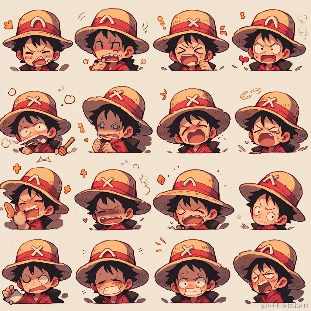 Monkey D. Luffy,popmart style,16 emoticons, emoji sheet, multiple poss and expressions --niji 5 --style expressive