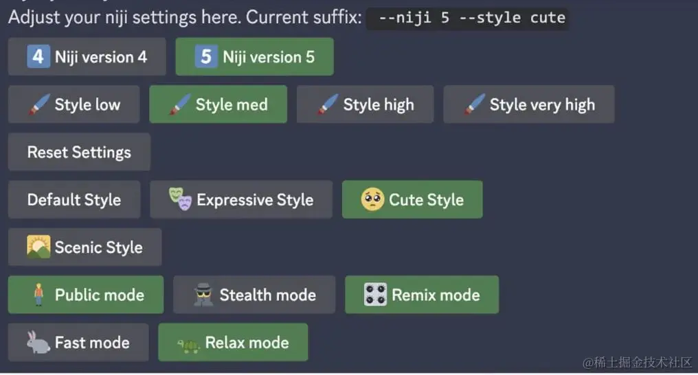 选择niji模式作图 如果你想做的表情包是动漫风格,先调成niji模式 然后调出/settings命令,选择Cute style 或者expressive style风格