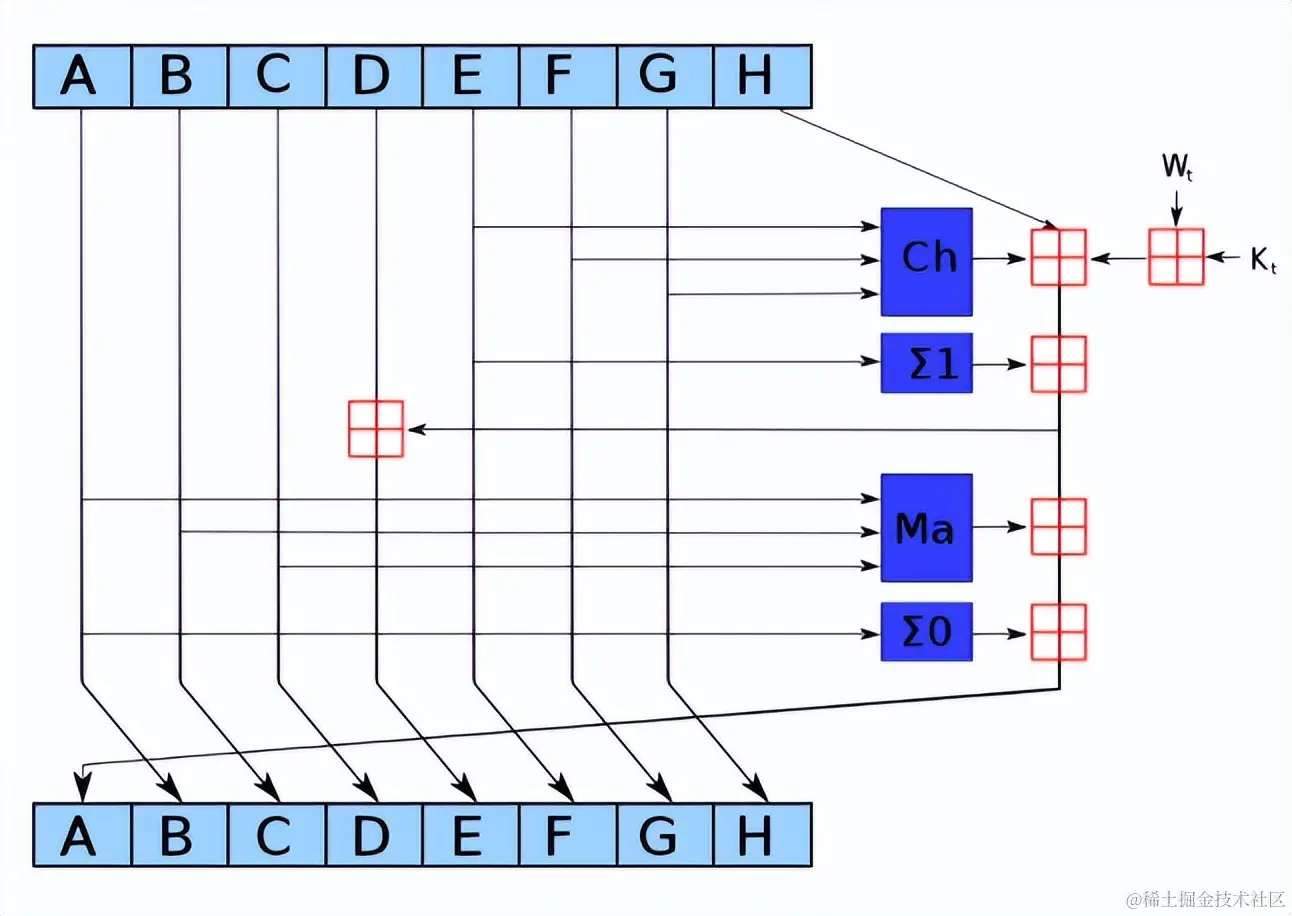 sha-2系列算法,核心过程更复杂一些,把信息摘要分成了A,B,C,D,E,F,G,H八段。