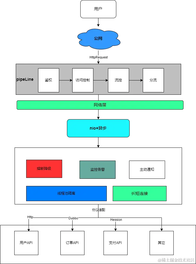 API网关采用pipeline(责任链模式)实现网关的核心处理流程,将每个处理逻辑看成一个pipe,每个pipe处理一件事情。这样无论增加处理逻辑还是增加不同协议的服务,仅需新增一个pipe到调度逻辑,想要禁用某个pipe,也能静态或者动态排除它,即可插拔性。客户端请求过来之后通过pipeline实现鉴权、访问控制、流控以及分流等一系列的前置逻辑。底层容器基于netty实现,对外暴露统一采用http协议,请求由容器线程池处理,之后分发到应用线程池异步处理。应用线程池在设计之初考虑不同类型的任务可能会出现耗时不一的情况,所以将任务拆分到不同的线程池以做隔离,提高不同类型任务的并发度,从而提高整体的吞吐。