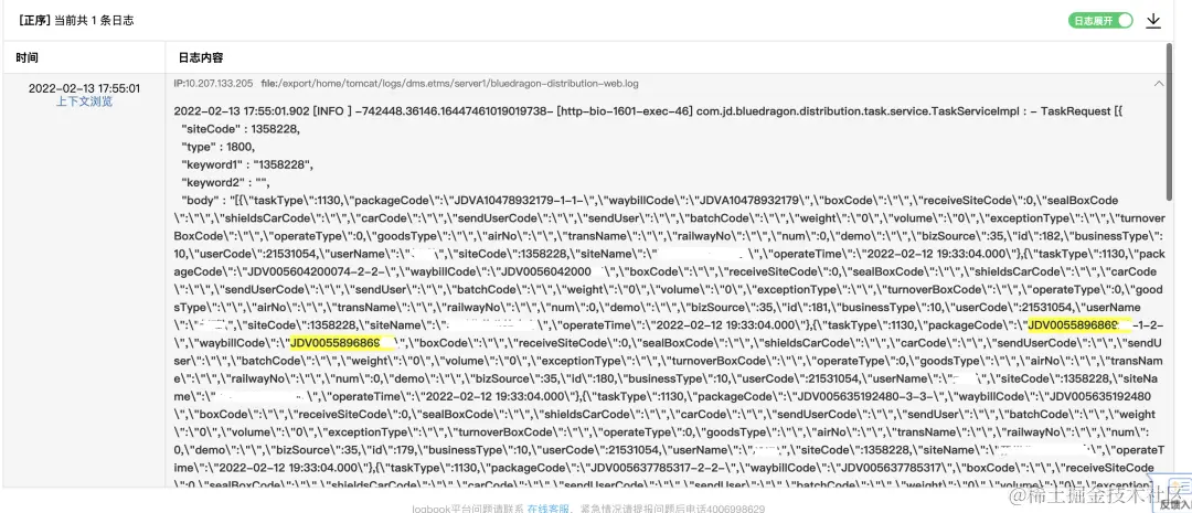 查询系统日志,根据运单号JDV0055896869XX定位具体请求报文: