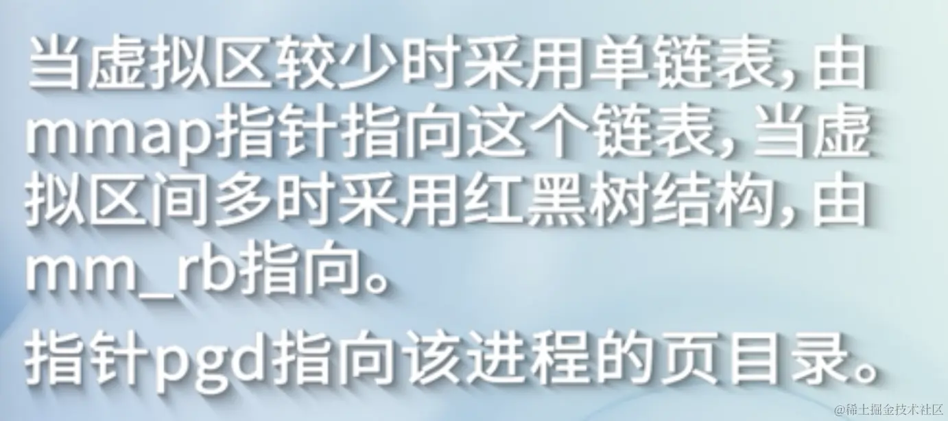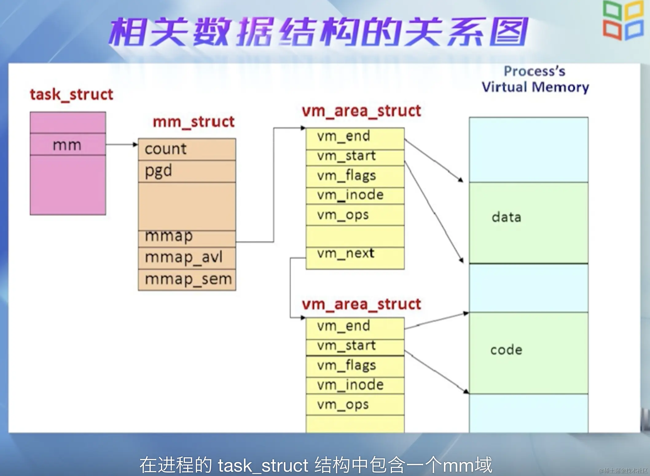 一个进程的用户地址空间由两个数据结构来描述, mm_struct和 vma_area_struct ,前者对进程整个用户空间进行描述,后者对用户空间的各个内存区进行描述