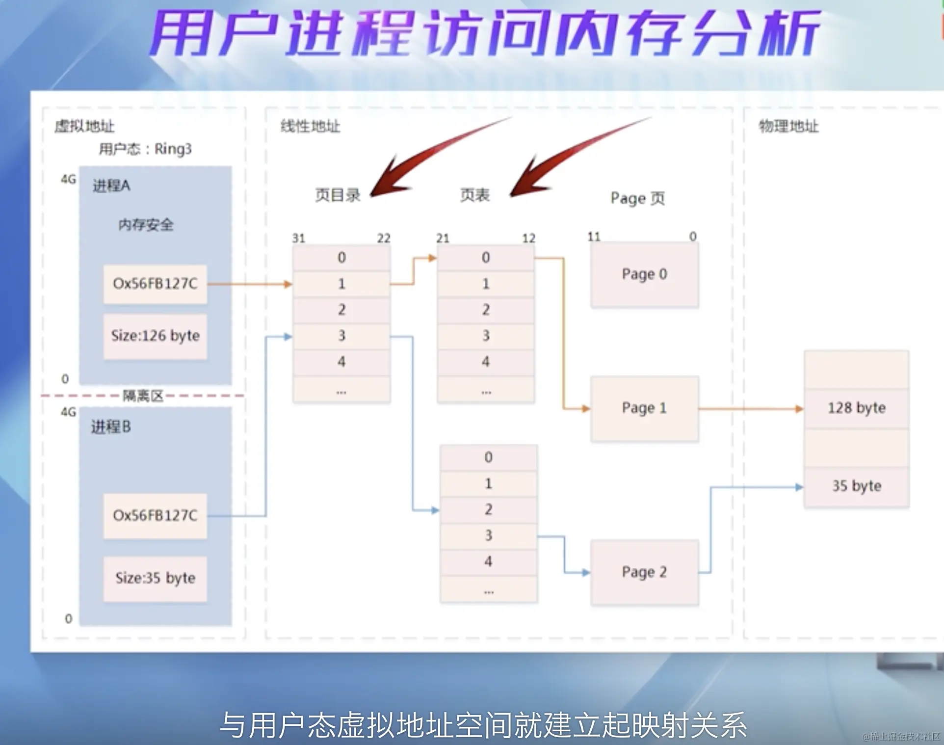 用户态进程独占 虚拟地址空间,两个进程的虚拟地址空间完全可能是相同的. 在访问用户态虚拟内存空间时,如果没有映射到物理地址,这时就需要通过请页机制发出缺页异常的请求, 缺页异常陷入内核,分配物理地址空间,与用户态虚拟地址空间就建立起了映射关系