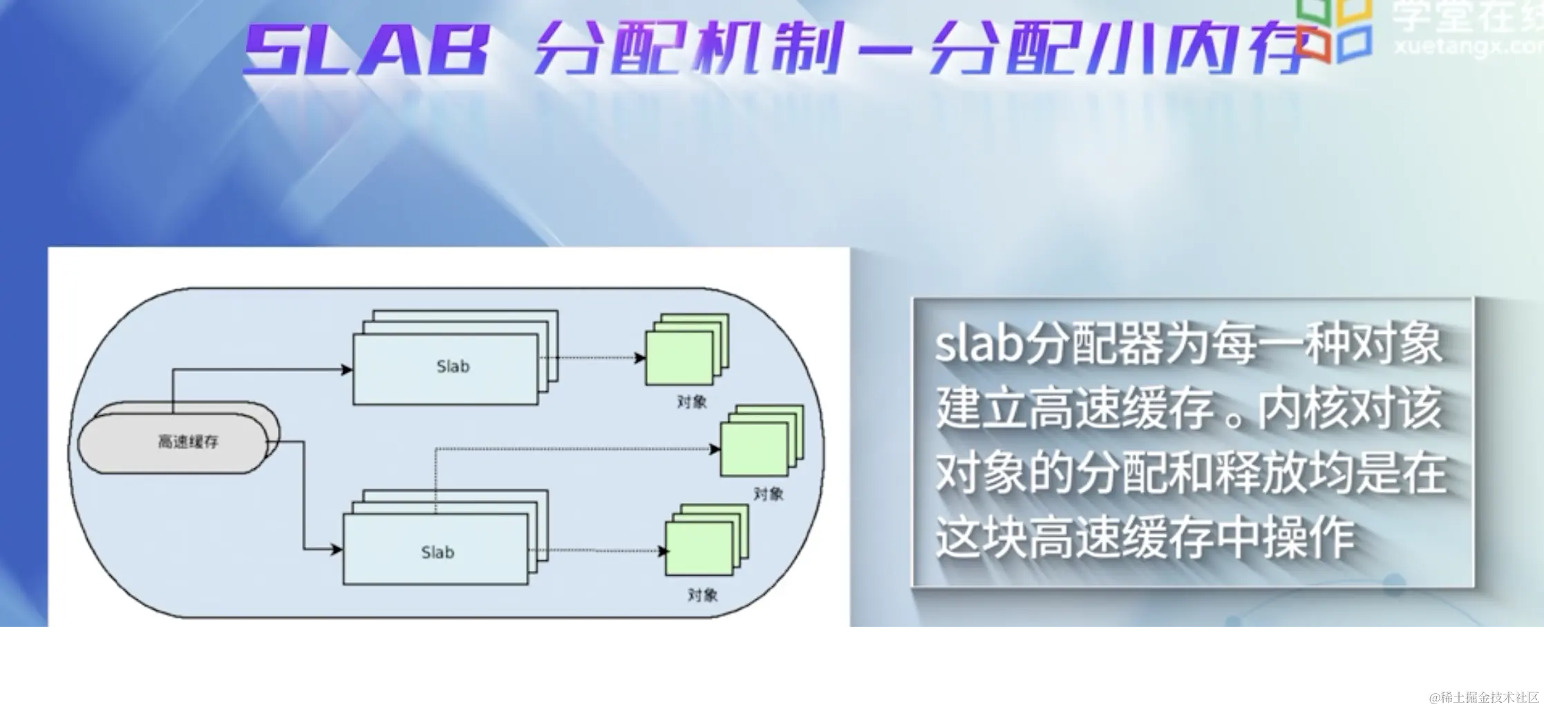 slab缓存: 服务小块物理内存的分配,并且它也作为高速缓存,主要针对内核中经常分配并释放的对象.