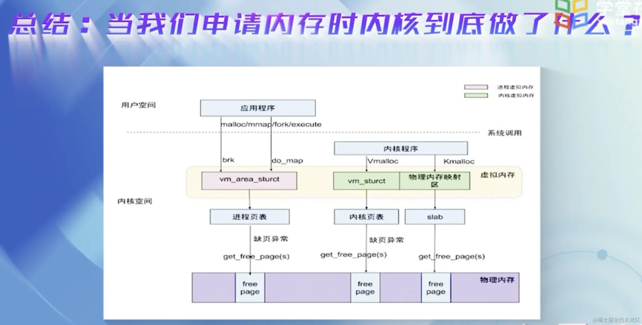 当用户程序通过系统调用,申请内存时,首先陷入内核,建立虚拟地址空间的映射,获得一块虚拟内存区VMA. 当进程对这块虚存区进行访问时,如果物理内存尚未分配,此时发生一个缺页异常,通过getfreepage申请一个或者多个物理页面,并将此物理内存和虚拟内存的映射关系写入页表.