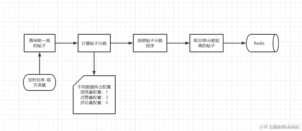 - 根据自己规定的算法,对帖子计算出指定权重,并按照 帖子 id 为 member, score 为计算的权重 存入Redis 中。