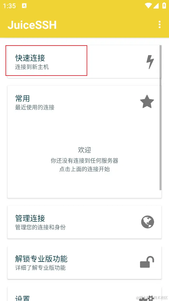 在手机端,我们下载JuiceSSH,软件,下载软件可以在网上搜索下载,下载后打开软件,我们可以看到快速连接,点击快速连接