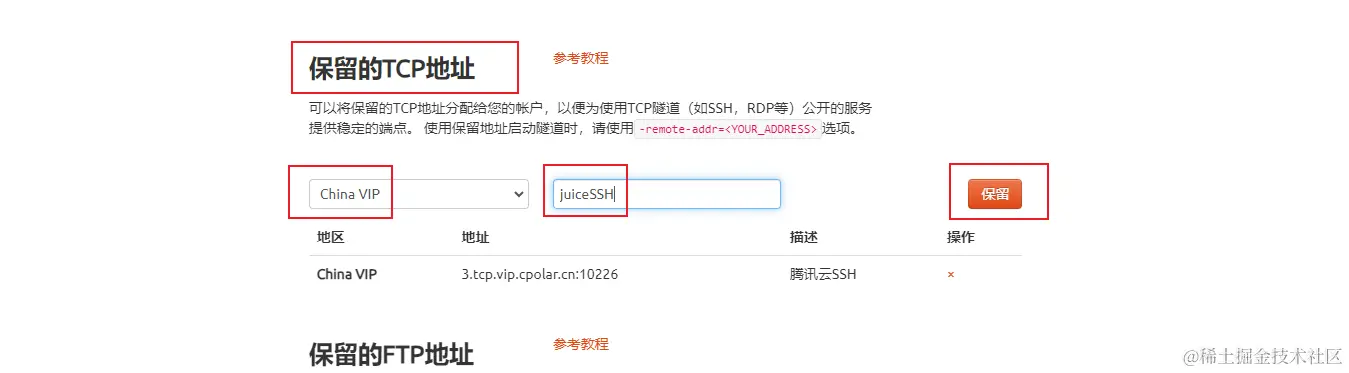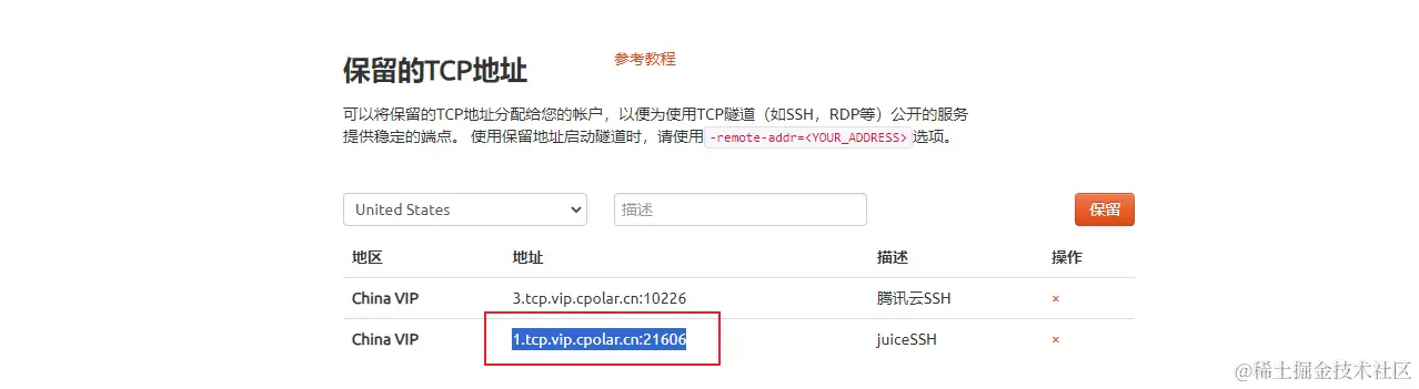 要注意的是,以上步骤使用的是随机临时tcp端口地址,所生成的公网地址为随机临时地址,该公网地址24小时内会随机变化。我们接下来为其配置固定的TCP端口地址,该地址不会变化,设置后将无需每天重复修改地址。