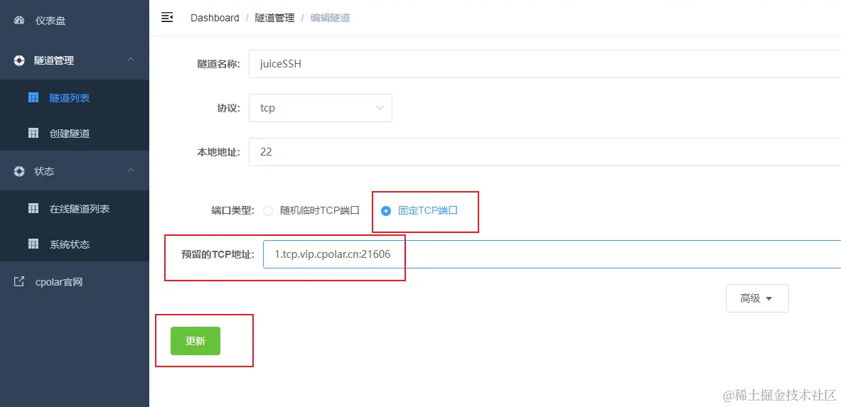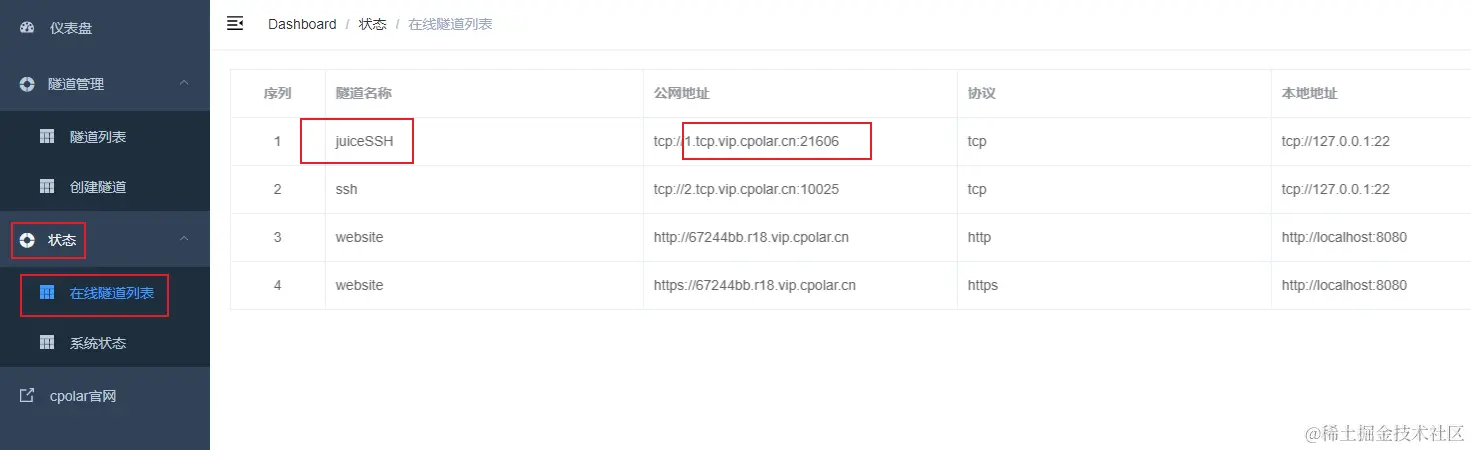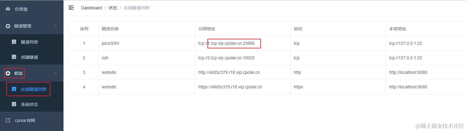 隧道更新成功后,点击左侧仪表盘的状态——在线隧道列表,可以看到公网地址已经更新成为了固定tcp地址。