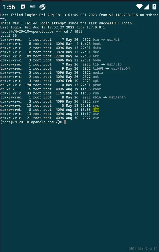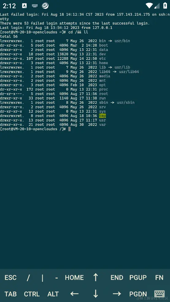 加下来成功连接上了我们的Linux服务器,这里以Ubuntu系统为例子,这样一个通过手机远程ssh 访问Linux服务器的地址就设置好了