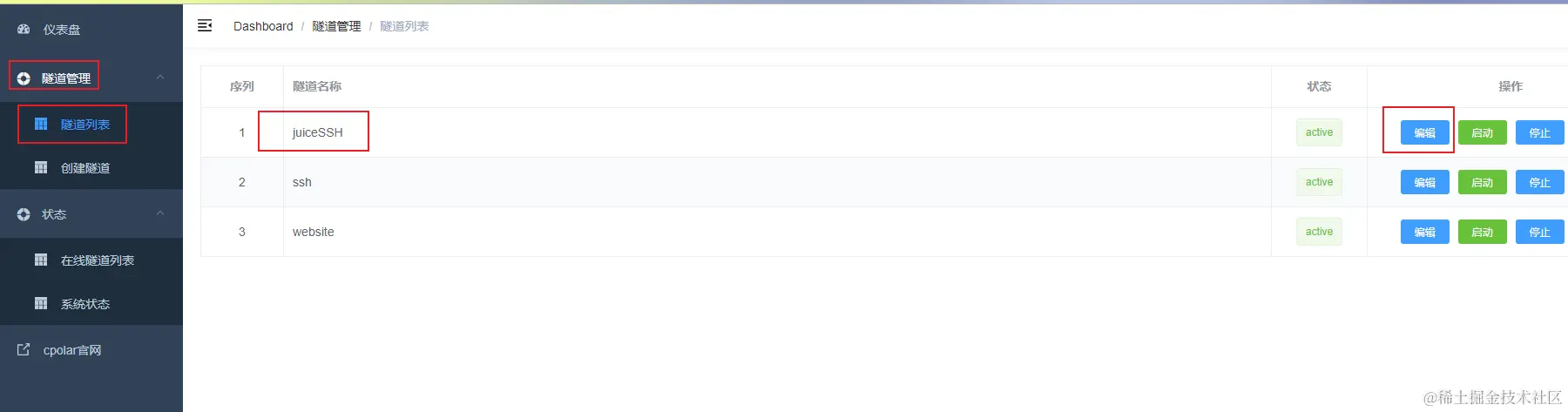 打开cpolar web ui管理界面,点击左侧仪表盘的隧道管理——隧道列表,找到我们上面创建的TCP隧道,点击右侧的编辑