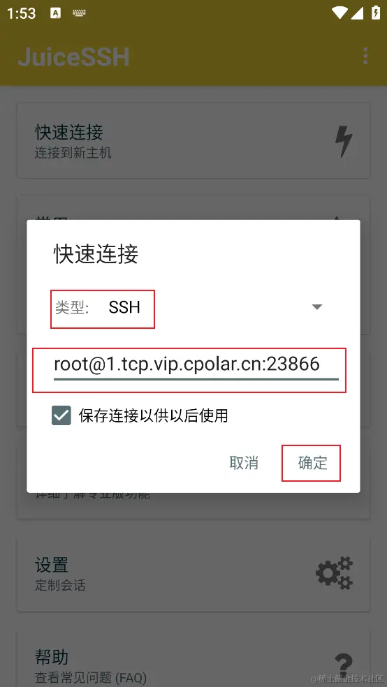 固定好了地址后,我们打开JuiceSSH ,使用我们固定的地址进行连接,同样输入的时候按照:用户名@cpolar地址格式进行输入,输入完成点击确定