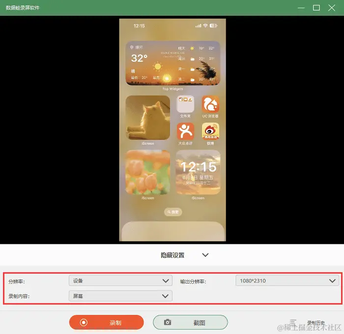第3步:投屏成功后,可以在录制页面进行设置,对设备的分辨率、输出分辨率和录制内容进行调整,然后就可以开始录制屏幕了。