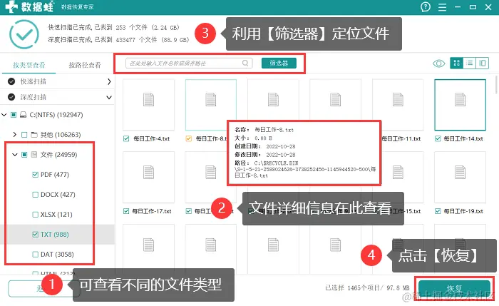 步骤4:首次扫描若找到所有需要恢复的文件,可直接单击右下角 【恢复】 ,若还有没被扫描到的文件,单击 【深度扫描】 ,等待扫描结束,建议直接在 【筛选器】中对所有需要恢复的文件进行快速定位和选择,再点击 【恢复】 。