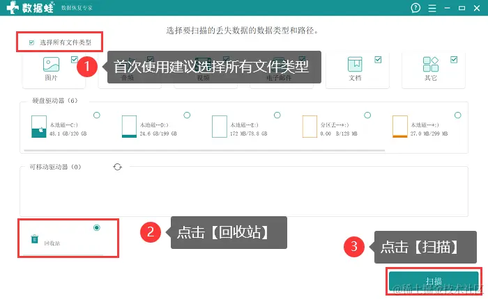 步骤2:选择扫描类型和驱动器。先对需要扫描的文件类型进行选择(如果之前没有使用过该软件,建议勾选所有文件类型),然后勾选上 【回收站】 ,并单击 【扫描】;