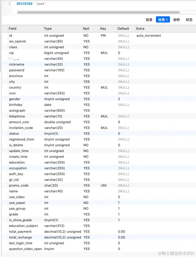 有这样一张user表,300多万行记录,表结构及索引信息如下: