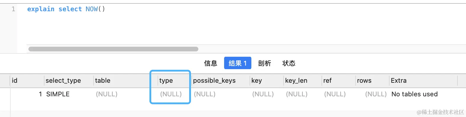 不用访问表或者索引,直接就能得到结果, 如 explain select NOW()
