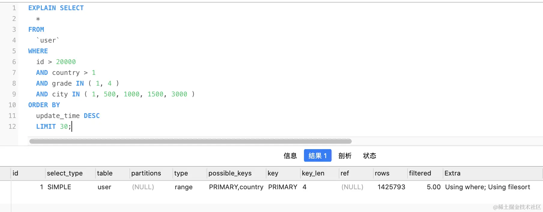 在带有order by子句的sql中,要尽可能使extra字段不要出现Using filesort,而是Using index