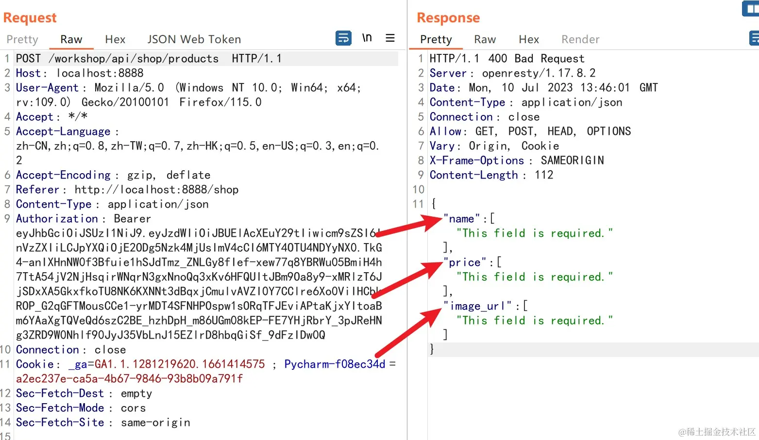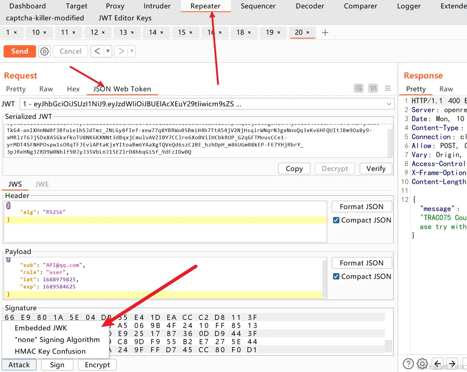 我们在访问Dashboard 的时候进行抓包,进入Repeater 中的JSON Web Token页面中: