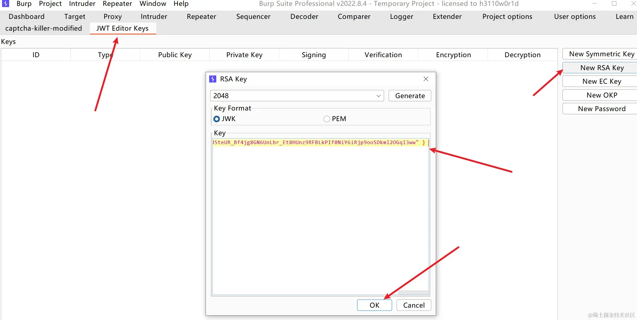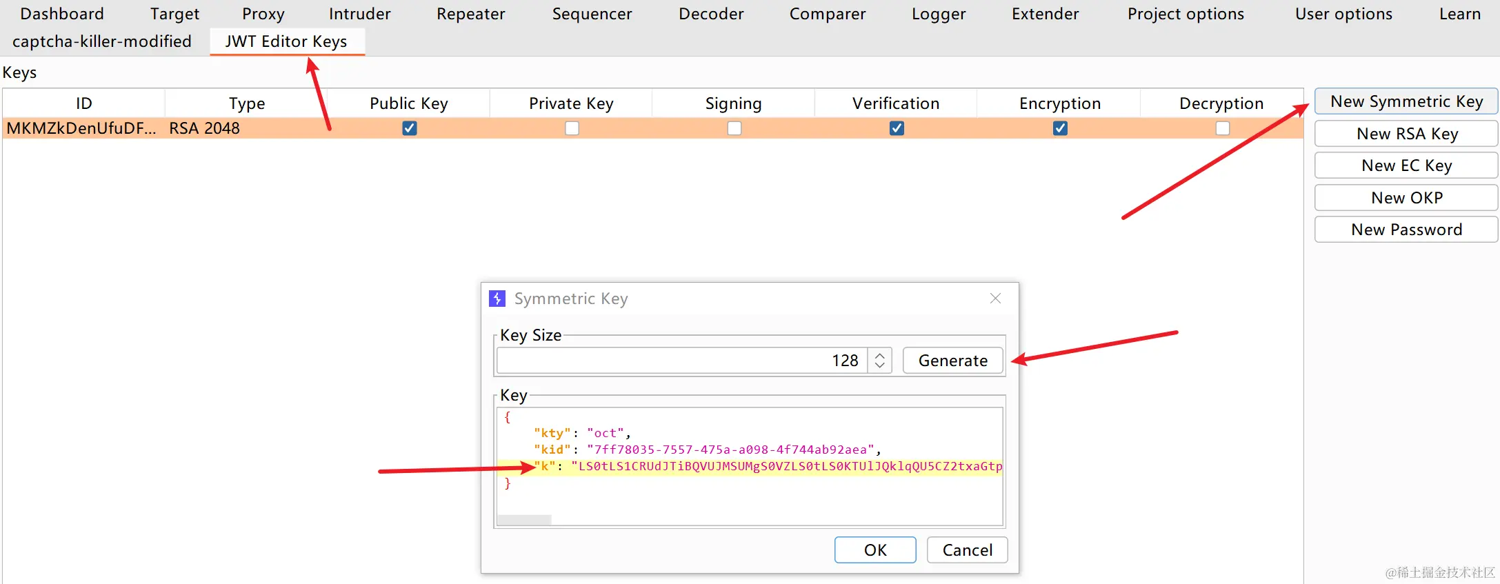 再次回到Burp 主选项卡栏中 的 JWT Editor Keys选项卡,点击New SymmetricKey后Generate,将 k 属性的生成值替换为PEM Base64编码