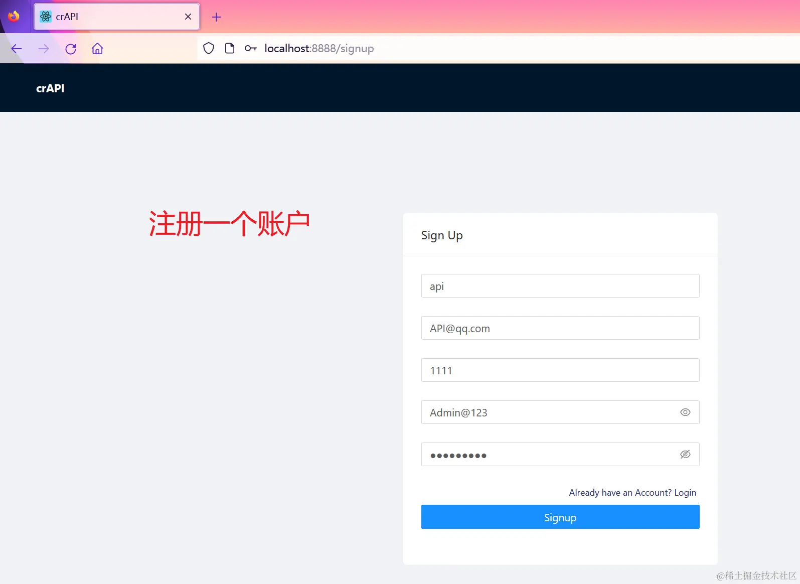 - 注册一个账户,邮箱为[API@qq.com],密码为Admin@123